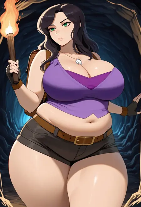 Black hair, long hair, green eyes, purple shirt, sleeveless, bare shoulders, shorts, short shorts, belt, gloves, fingerless gloves, necklace, pendant
