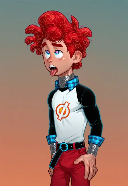p3nn, curly red hair, messy hairstyle, textured hair pattern, shiny highlights, blue eyes,