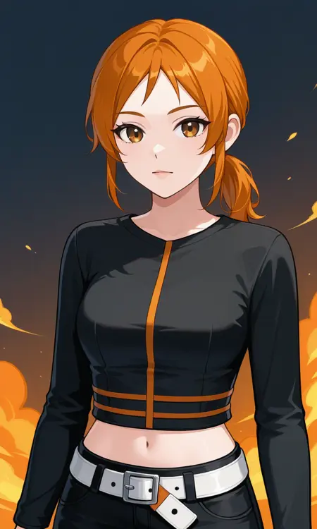 Mia Render,1girl,solo,orange hair,brown eyes,ponytail,shirt,cropped shirt,black shirt,long sleeves,crop top, navel,midriff, pants, black pants,belt, white belt,