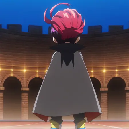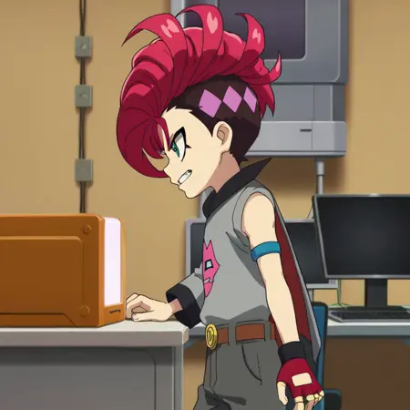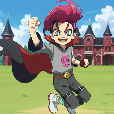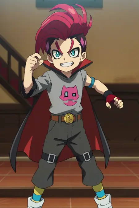 Prompts: male, multicolored hair, three-tone hair, red hair, dark purple hair, pink hair, mohawk, turquoise eyes, v-shaped eyebrows, eyeliner, grey shirt, print shirt, asymmetrical sleeves, cape, single armband, single fingerless glove, belt, pants, leg straps, striped socks, boots