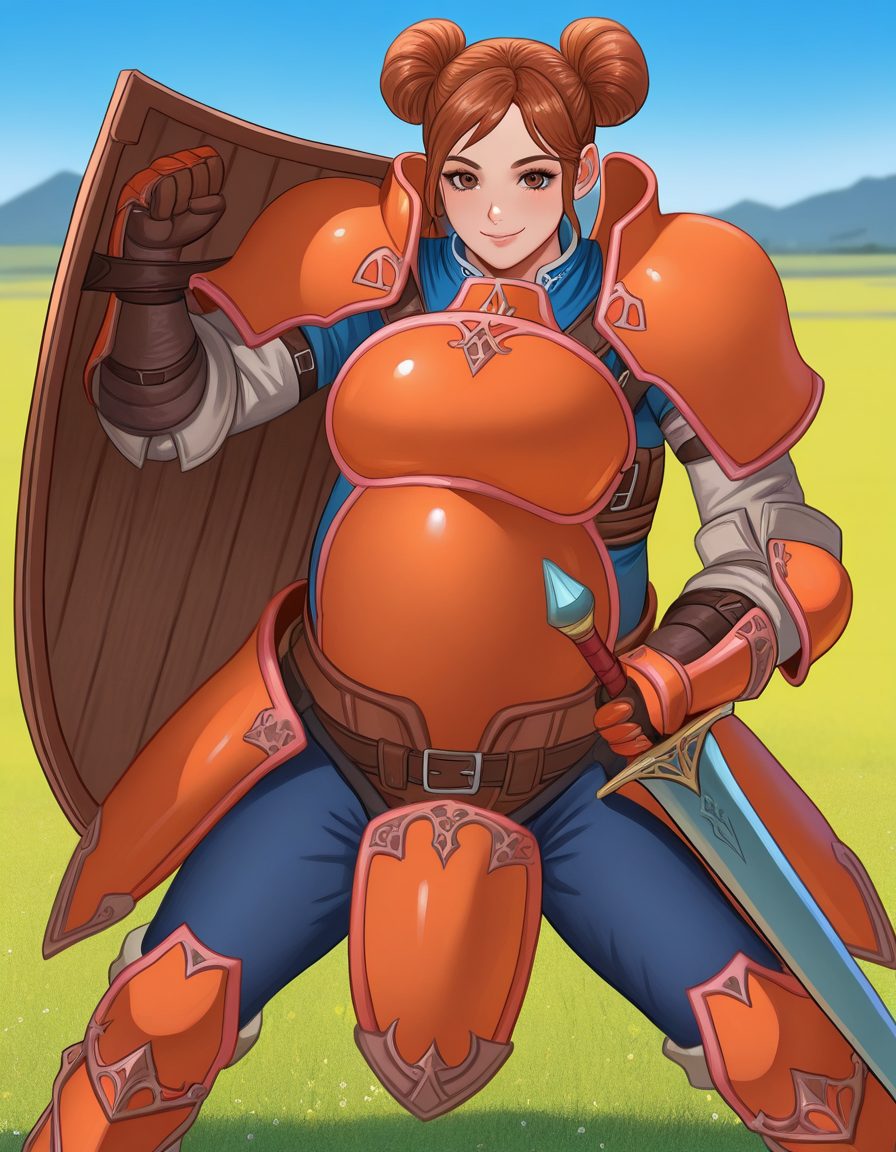 프롬프트: MegFE, 갈색 눈, 작은 눈, 통통한, 갈색 머리, 머리 땋기, 더블 땋기, 주황색 갑옷, 장갑, 장갑, 갑옷 부츠, 정강이 보호대, 허리 보호대, 어깨 보호대, 벨트, 검 들고, 방패 들고
