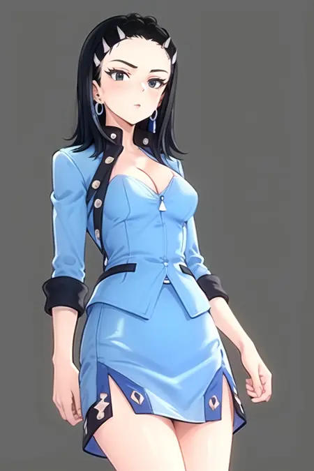 OraZiO, 1girl, solo, black hair, miniskirt, blue jacket, blue skirt, pencil skirt, medium hair, medium breasts, blue shirt, earrings, side slit, long sleeves, black eyes, open jacket, cleavage
