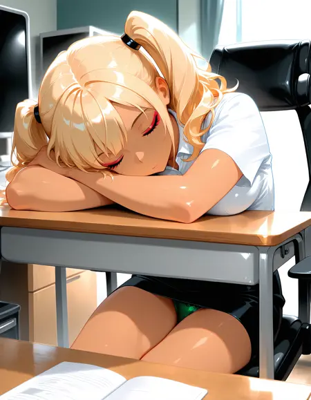 A LoRA that captures the quiet moment of resting face-down on a desk. Depending on the pose and angle, a cheeky glimpse may appear—entirely up to your taste.