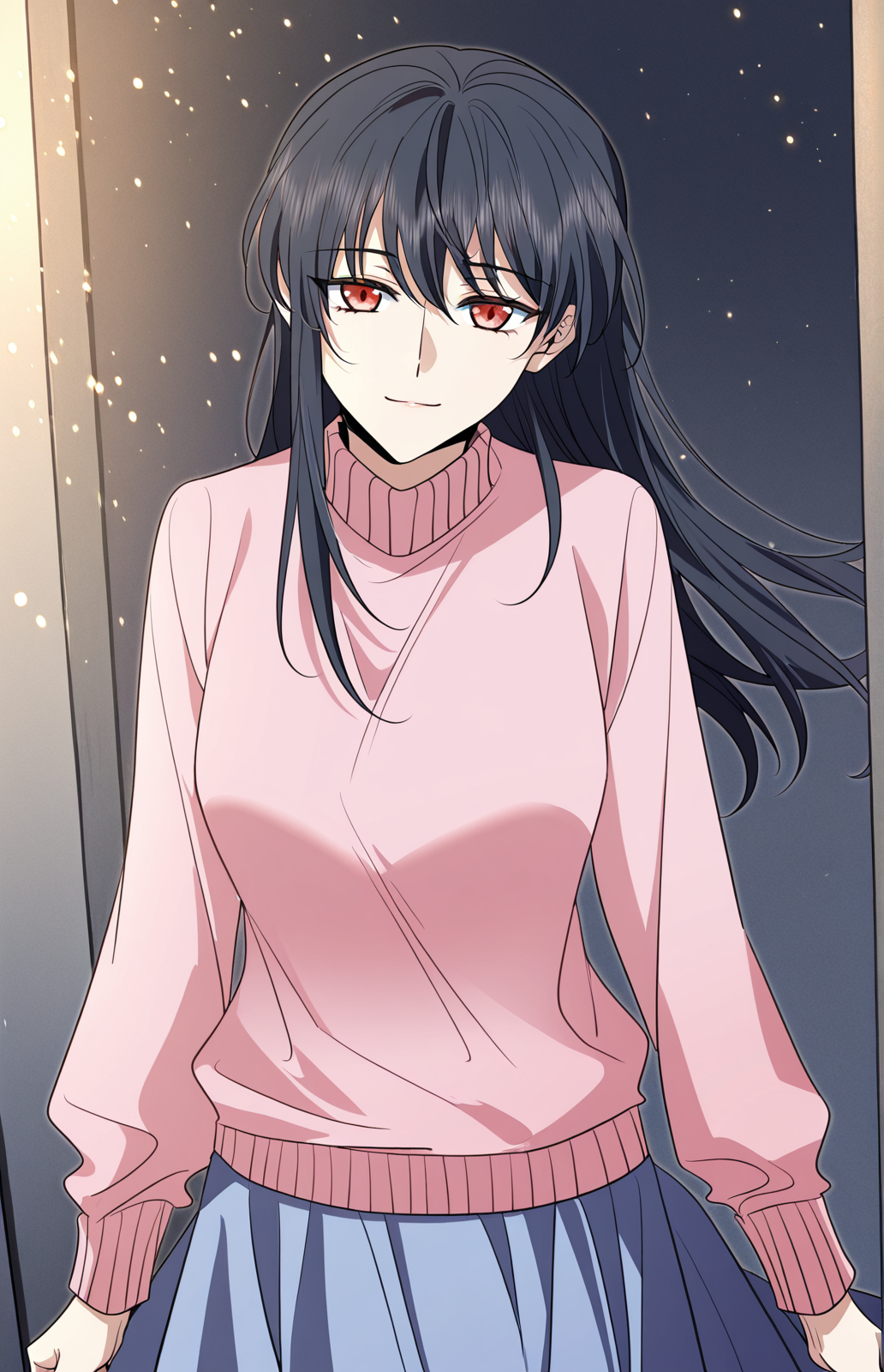江河_衣装4、ピンクのセーター、ルーズなセーター、長袖、リブ付き cuffs、リブ付きヘム、高めの襟、リブ付き襟、青いスカート、ふわふわしたスカート、足首丈スカート、ピンクの室内履き