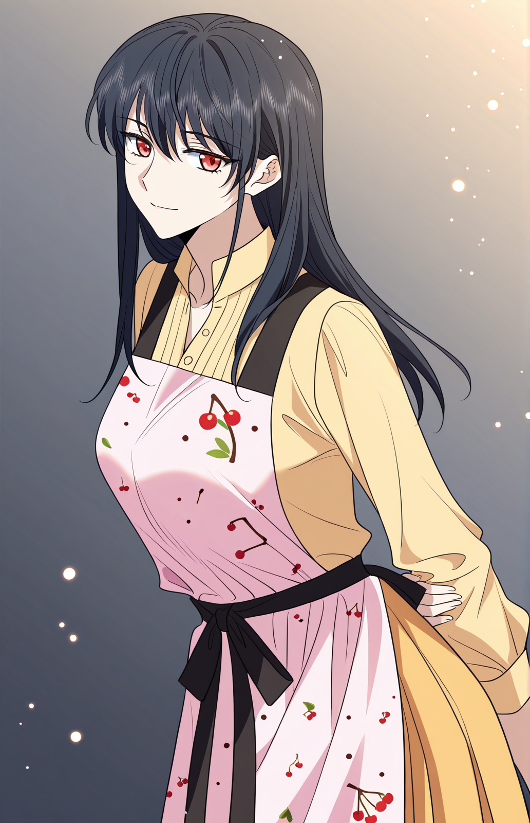 江河_衣装9、黄色のシャツ、長袖、ボタン式シャツ、折りたたみ襟、白いフロントパネル、プリーツ入りフロント、薄いピンクのエプロン、プリントエプロン、猫柄、桜柄、黒いストラップ、ウエストで結ぶエプロン、黄色のスカート、ロングスカート、