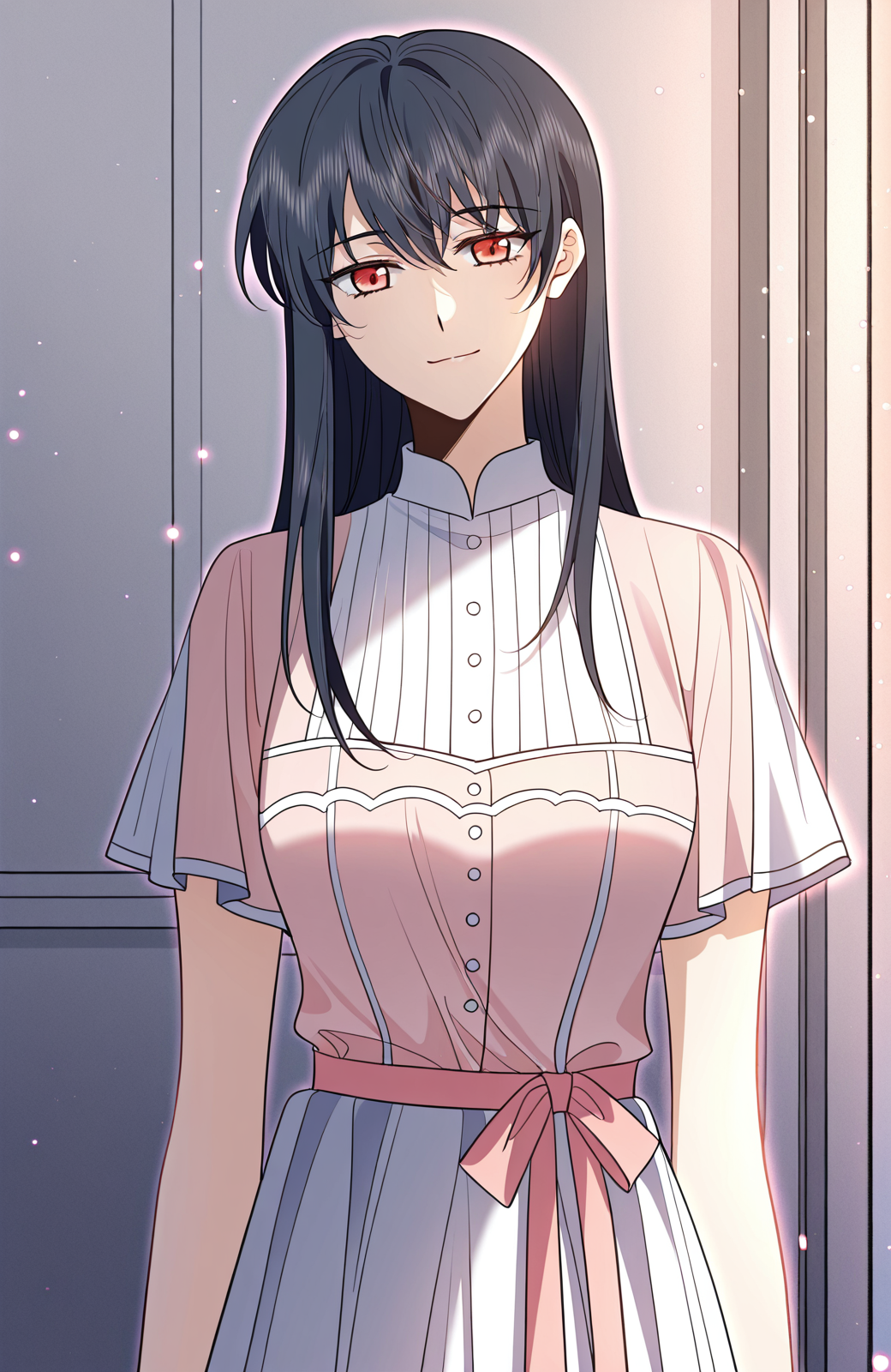 江河_衣装1、薄いピンクと青のドレス、高めの襟、白い襟、短い袖、薄いピンクの袖、側面スリット付き袖、白いトリム付き袖、プリーツ入りボディ、ボタン前開き、リボンベルト、ピンクのベルト、すね丈スカート、白いスカート、室内履き、ピンクの室内履き、