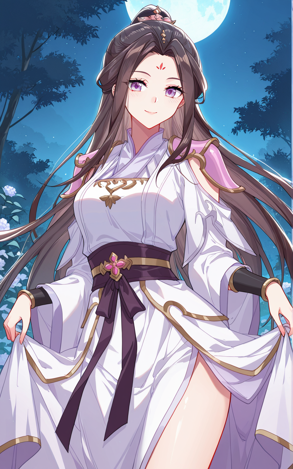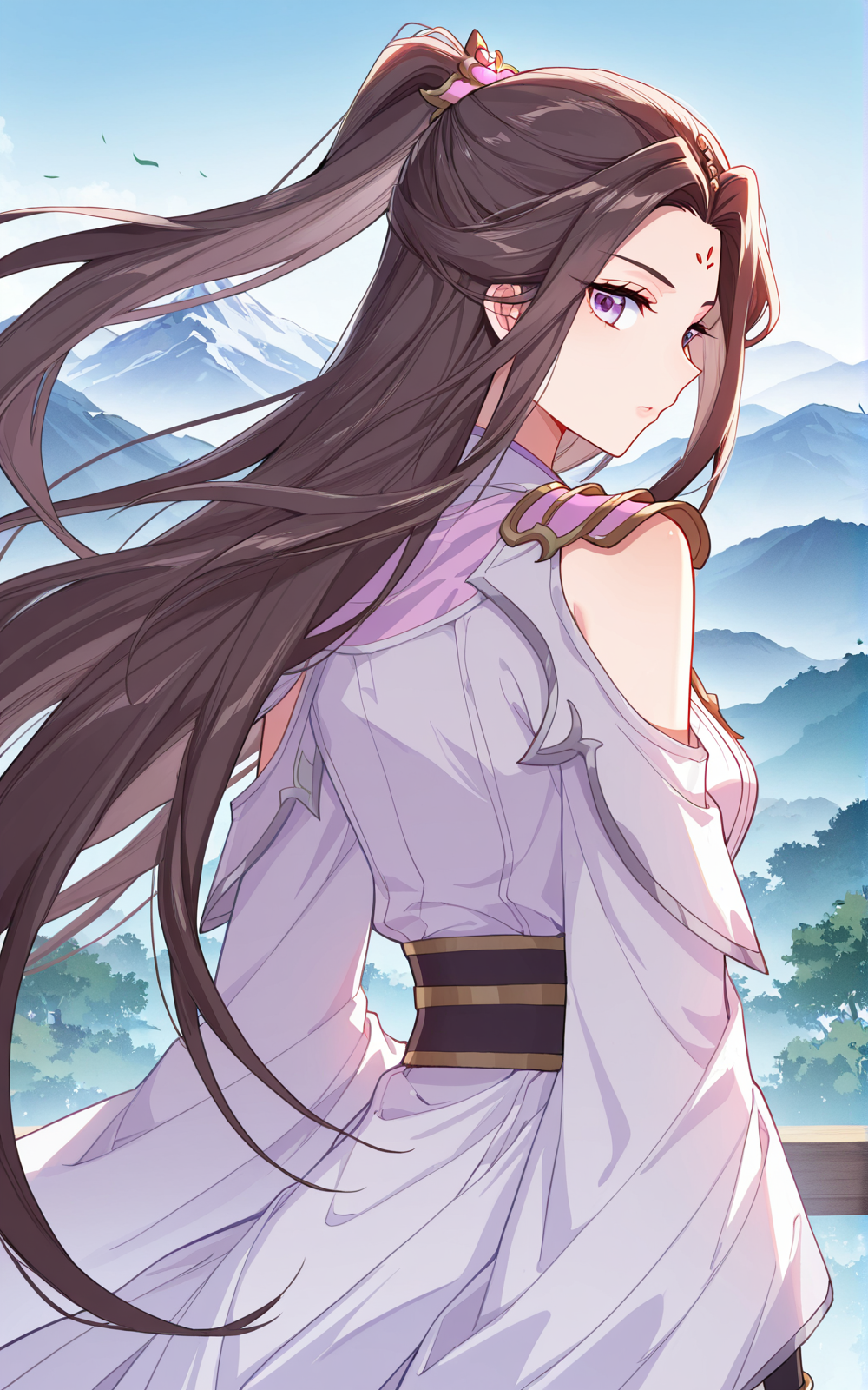 Liqingchan、1人娘、シングル、紫の目、濃い茶色の髪、長い髪、中央分けの前髪、長い横髪、高いポニーテール、ふわふわの後ろ髪、髪飾り、金色の髪飾り、額のマーク、赤い額のマーク、