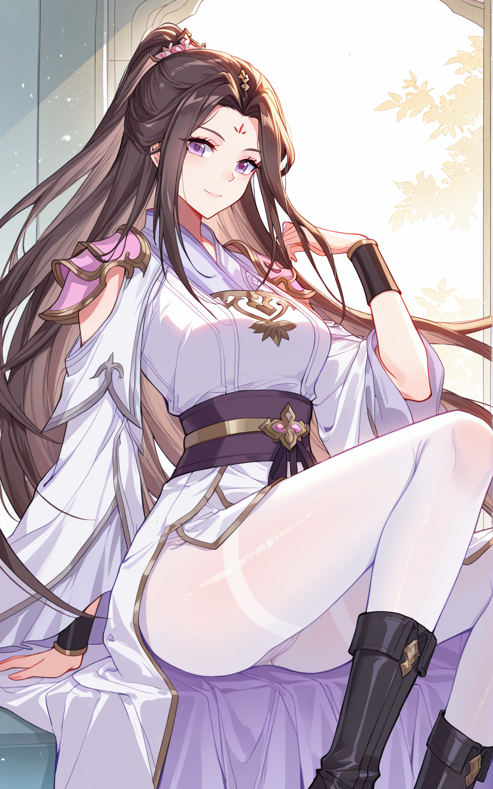 Liqingchan_衣装、白い外のローブ、開いた外のローブ、肩の切り替え、長い袖、広い袖、ピンクの肩アーマー、金縁の肩アーマー、白いトップ、金縁のトップ、白い内側のローブ、ピンク縁の内側のローブ、高い襟、濃い紫の帯、金の帯飾り、下がるペンダント、黒い手首のブレイス、長いオーバースカート、サイドスリットのオーバースカート、長いアンダースカート、白いアンダースカート、白いタイツ、黒いふくらはぎまでのブーツ