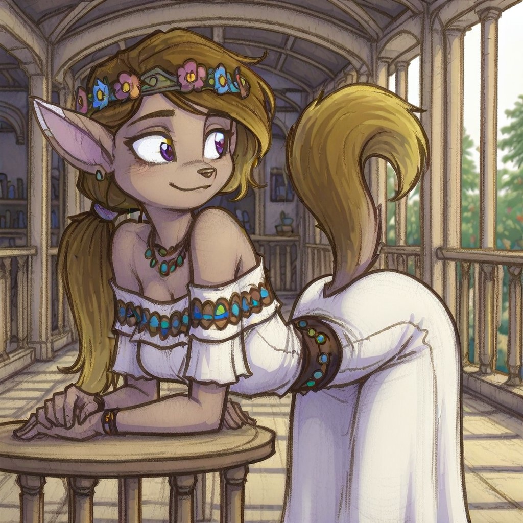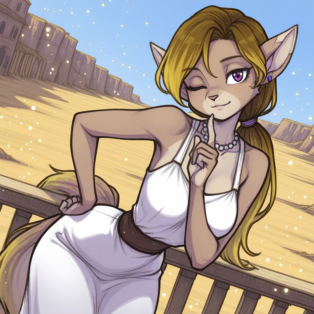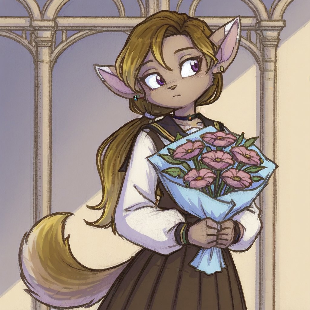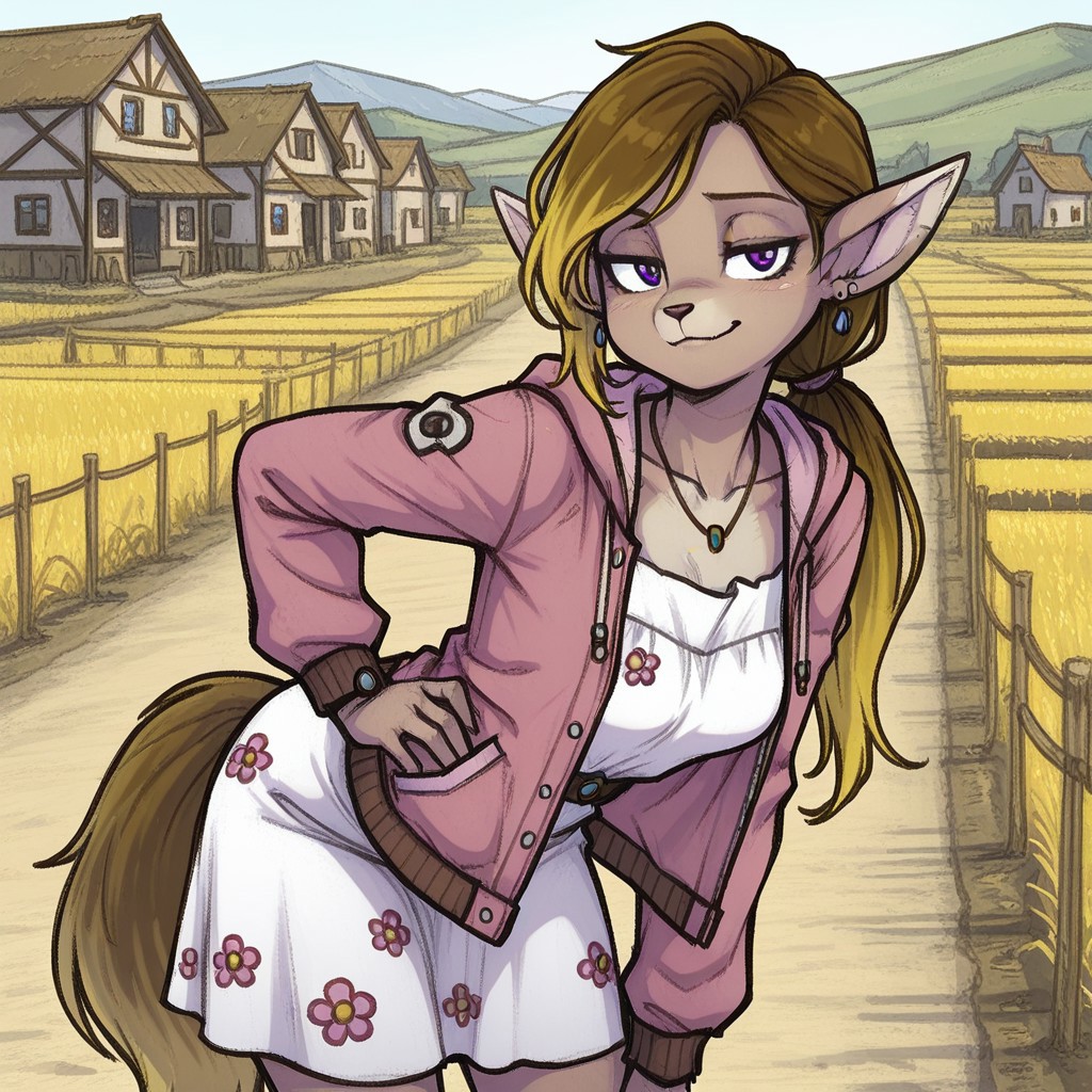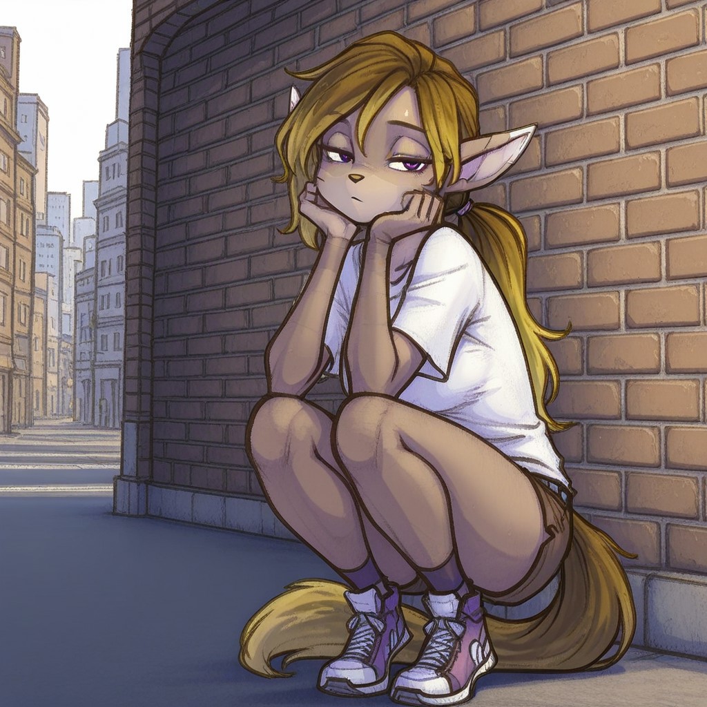 cindy, 1girl, solo, furry, furry female, long hair, brown hair, ponytail, blonde hair, animal ears, purple eyes, tail,