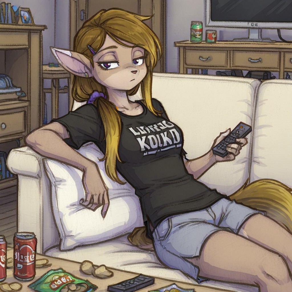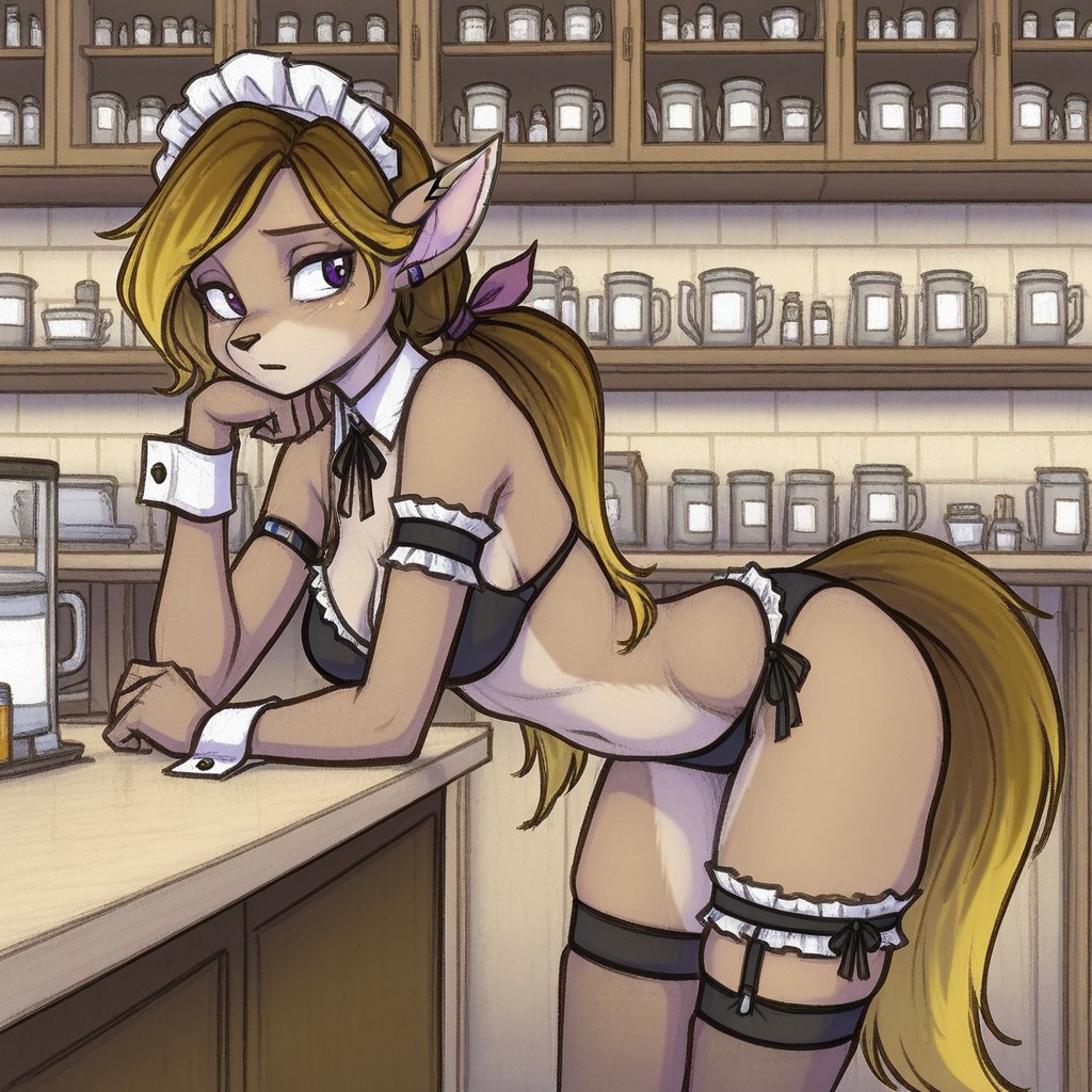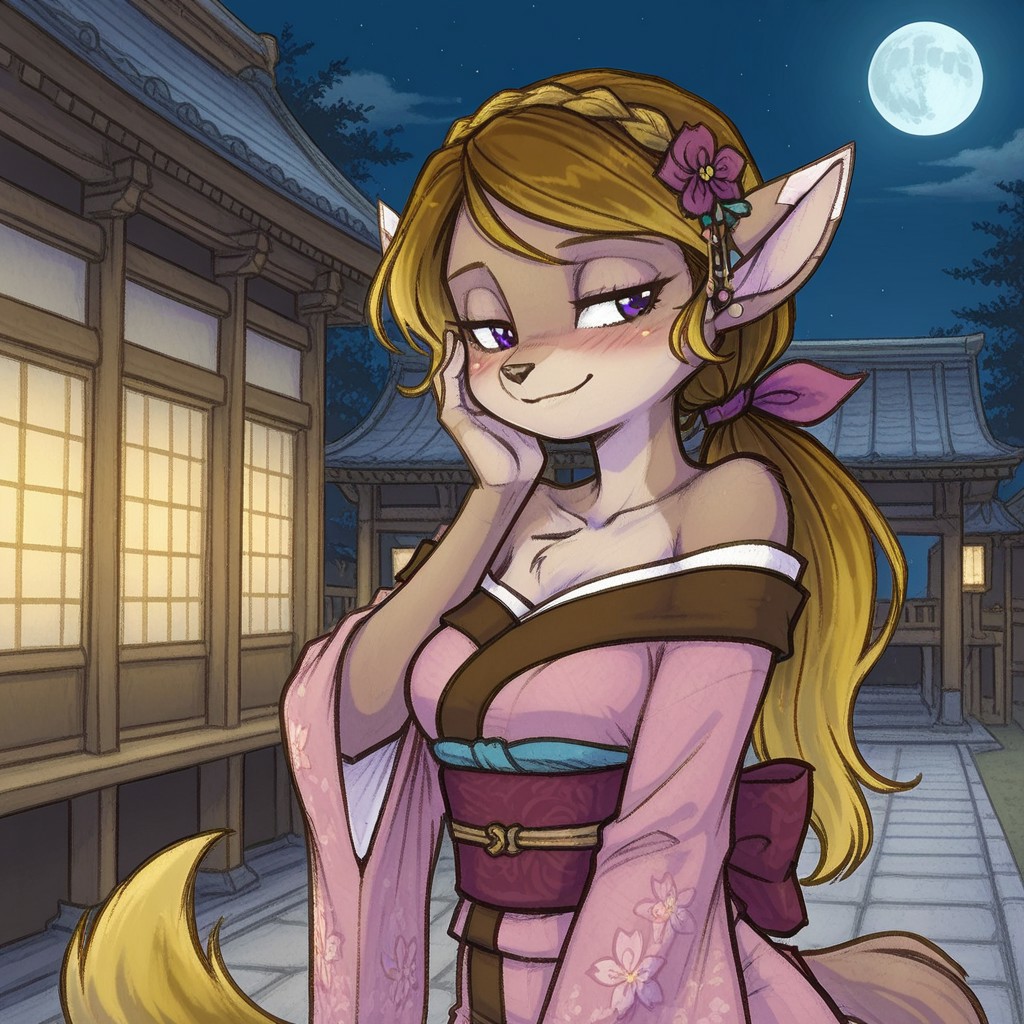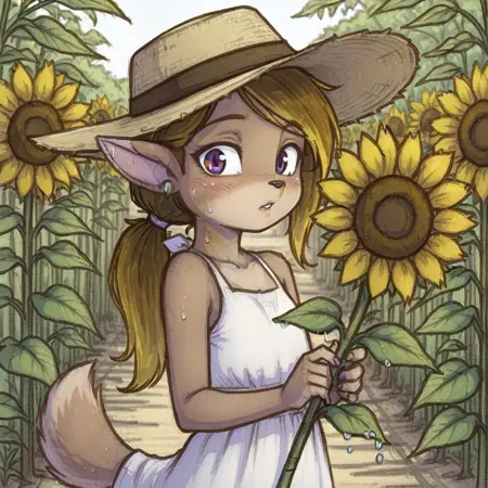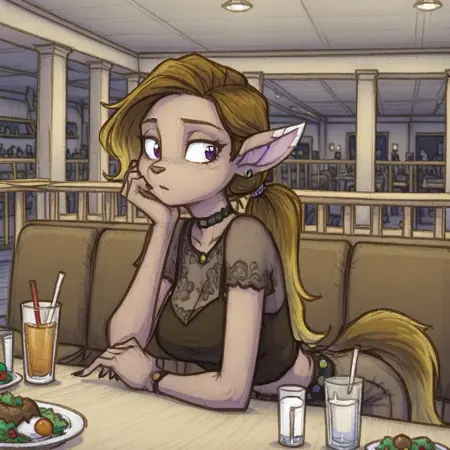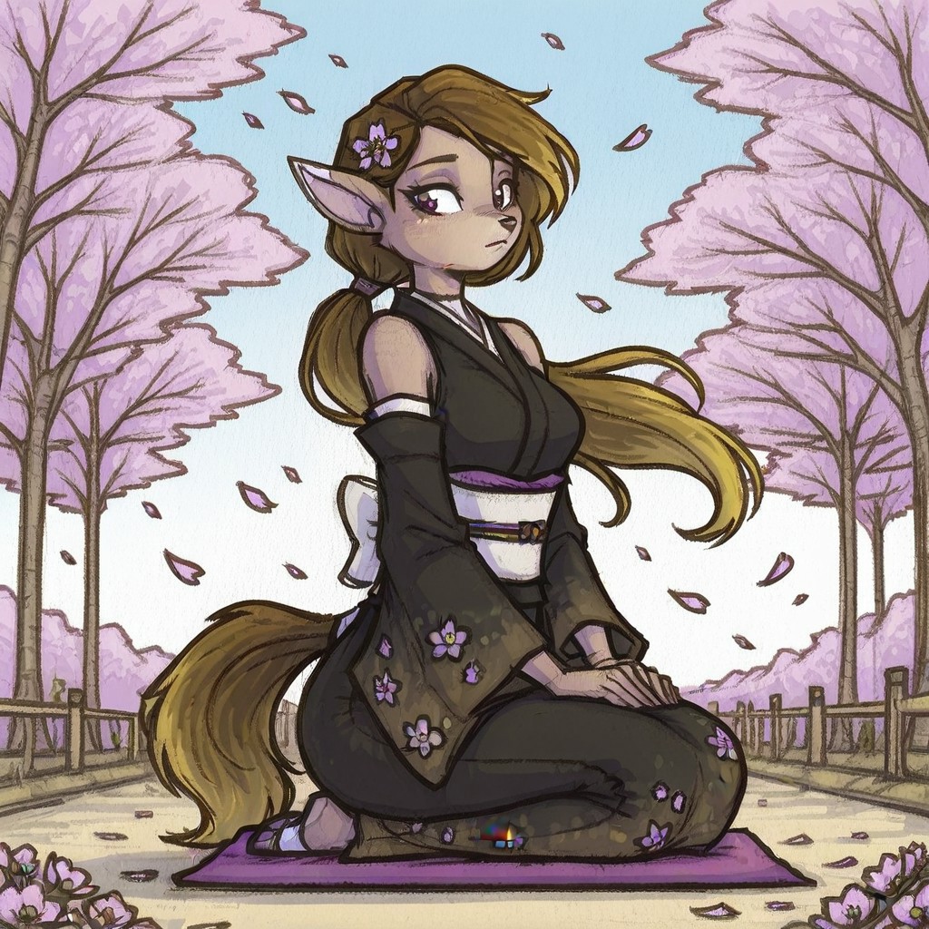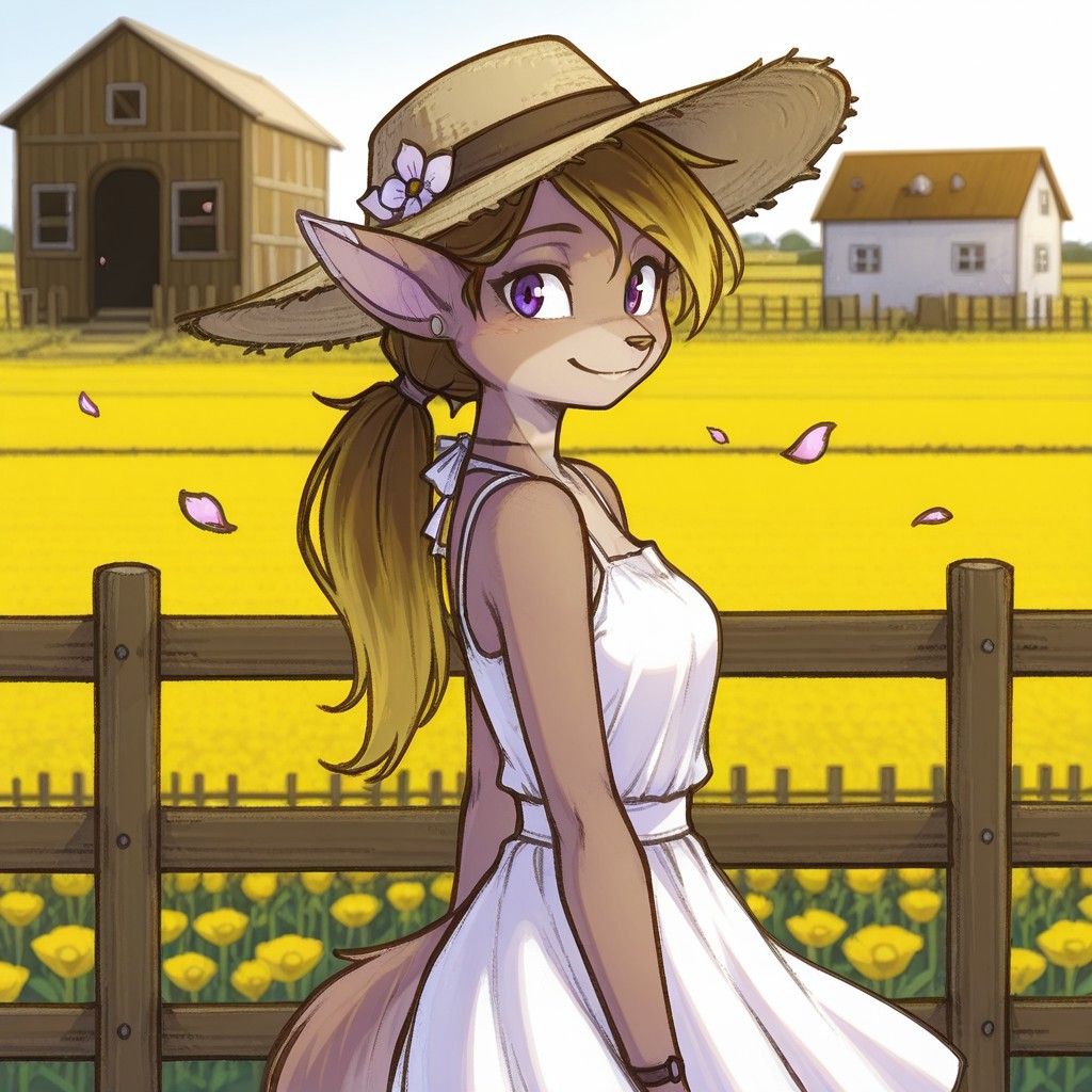 cindy, 1girl, solo, furry, furry female, long hair, brown hair, ponytail, blonde hair, animal ears, purple eyes, tail,