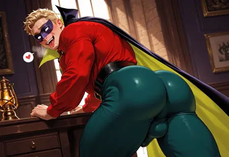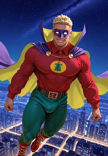 Gay, male, male focus, mature male, muscular male, GL_4LL4N, blonde hair, short hair, Red shirt, long sleeves, puffy sleeves, belt, purple mask, red boots, green pants, purple cape