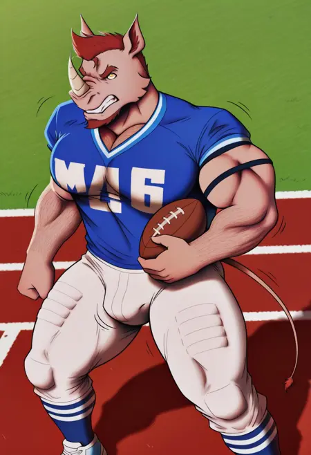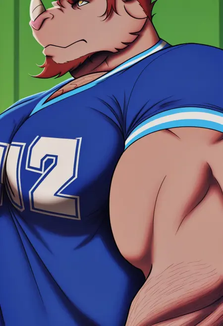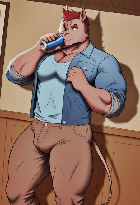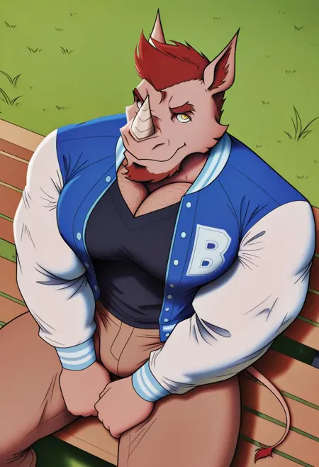 強化プロンプト: "furry, male, single horn, yellow eyes, tail, red hair"