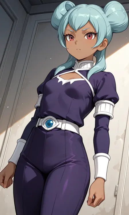 오르카 (이나즈마 일레븐), ((갈색 피부)), 긴 머리, 머리 땋기, 더블 붐, 트윈 붐, 연한 아쿠아색 머리, 빨간 눈, 작은 가슴, 가슴, 허벅지, 팔밴드, 스포츠복, 더블 붐, 보라색 셔츠, 벨트, 보라색 바지, 프로토콜 오메가, 긴 소매