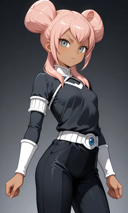 오르카 (이나즈마 일레븐), ((갈색 피부)), 긴 머리, 머리 땋기, 더블 붐, 트윈 붐, 분홍색 머리, 회색 눈, 작은 가슴, 가슴, 허벅지, 팔밴드, 스포츠복, 더블 붐, 검은 셔츠, 벨트, 검은 바지, 프로토콜 오메가, 긴 소매