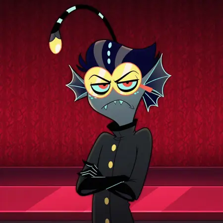 baxter, short, male, 2D, flat colors, yellow glasses, fins, teal skin, fish, lab coat, black gloves, sharp teeth, antennae,