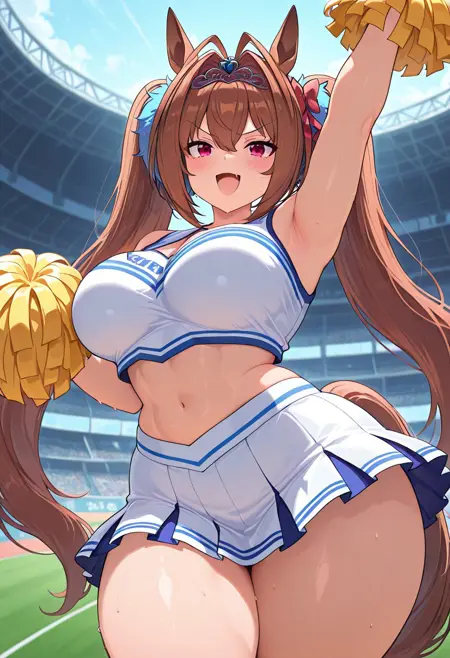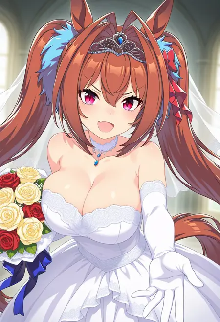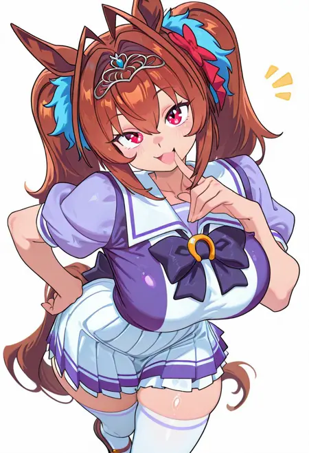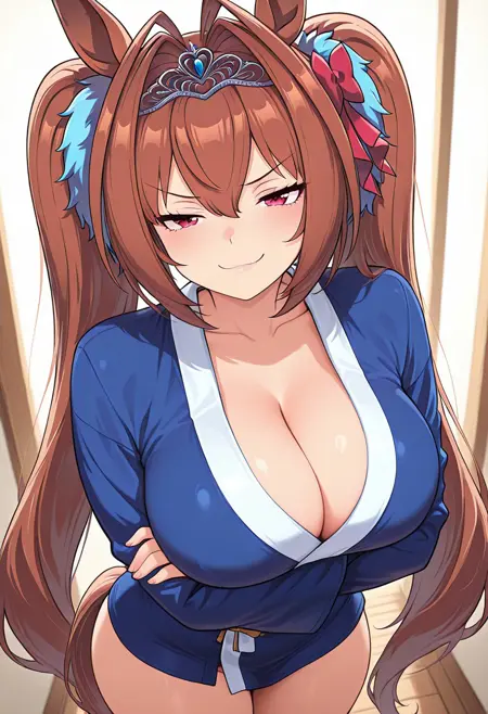 1girl, 红眼, 棕发, 双马尾, 马耳, 马尾, 发箍, 发丝内敛, 天线发, 眼间发丝, 大胸,(umamusume)