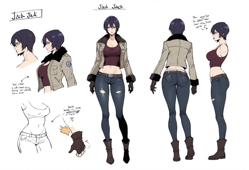 ジャケット、胸、ブーツ、腹部、ズボン、ベルト、大きい胸、中くらいの胸、破れた服、手袋、ファーのトリム、短めのジャケット、デニム、タンクトップ、ジーンズ、股間