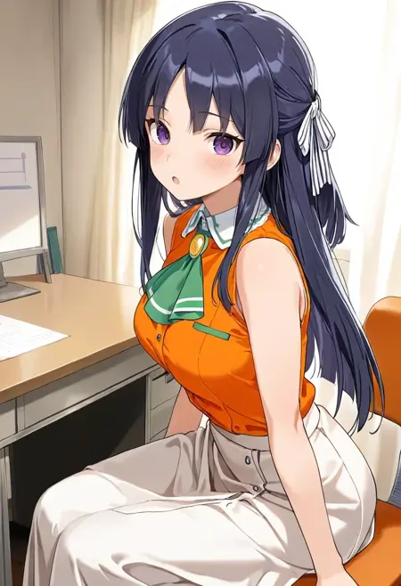 half updo,hair ribbon,sleeveless shirt,orange shirt,white collar,wing collar,green ascot,long skirt,white skirt,