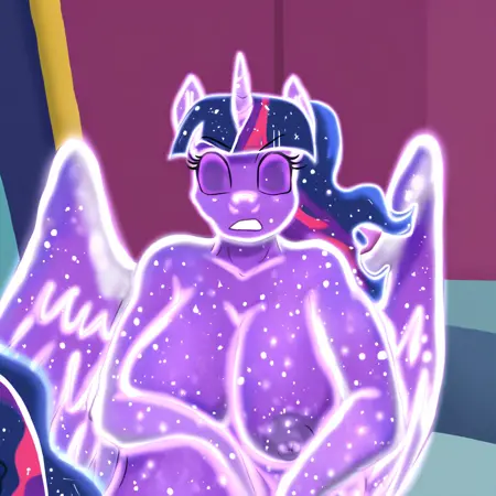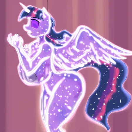 坦塔布斯暮光闪闪,翅膀,宇宙星辰身体,发光轮廓,银河纹理皮肤,无瞳孔,飘逸鬃毛,紫蓝色星云效果,夜空身躯。