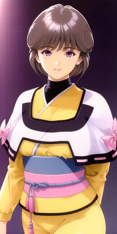 • Yellow_short_kimono_White_pantyhose_White_capelet_Pink_obi_Pink_bow: Ai's classic outfit.