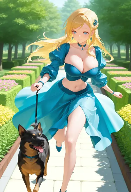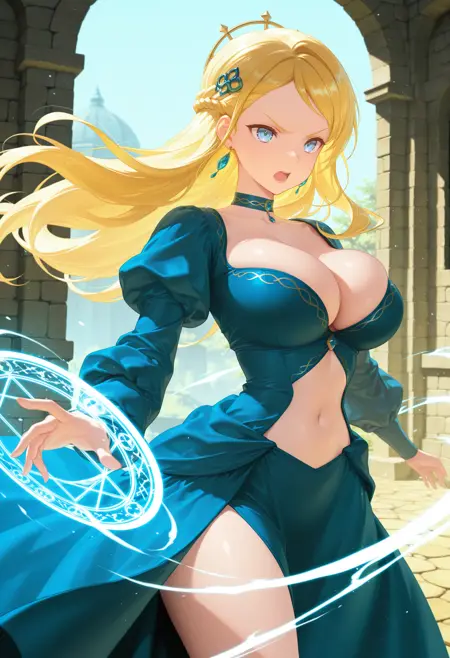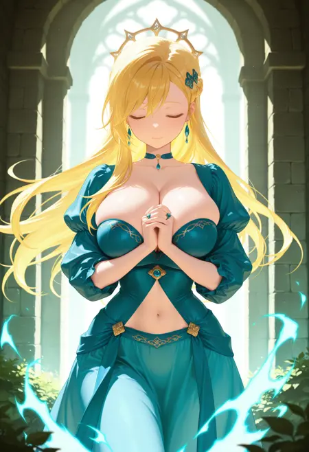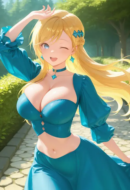 기본 프롬프트 : sarah_(ff3), blonde hair, large breasts, long hair, braid, jewelry, blue dress, cleavage, (hair ornament:1.1), choker, earrings, navel, midriff, puffy sleeves,