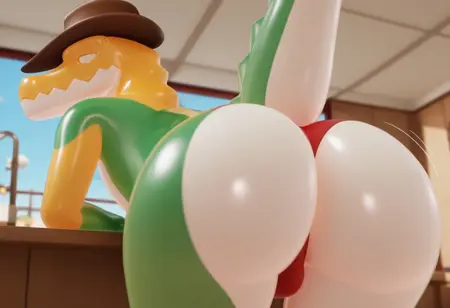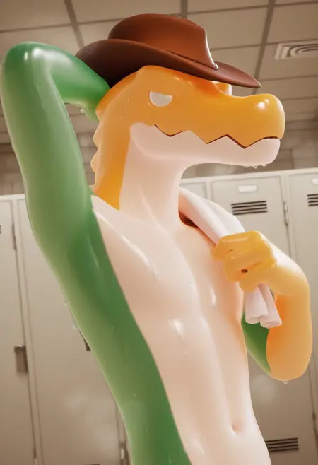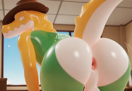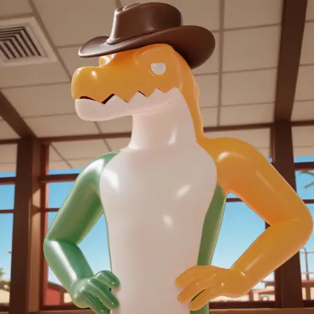 gummigoo, cowboy hat, white eyes, green arm, yellow arm, crocodile, snout, white belly, 3D, male, pokemon (creature),