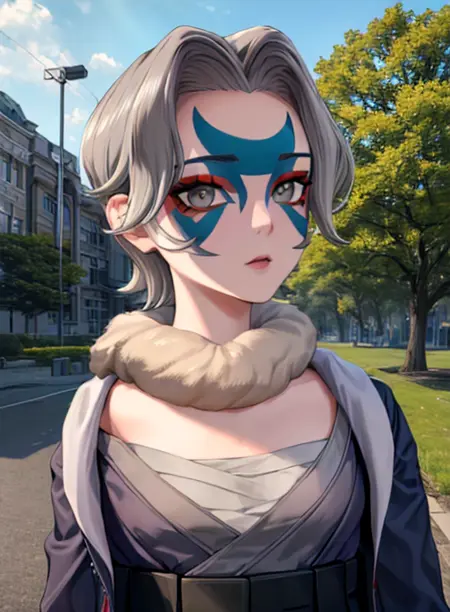 已测试于 0.7-1触发词charm, short hair, facepaint, makeup, grey eyes, facial mark, grey hair添加:jacket, short sleeves, parted lips, open clothes, fur trim, sarashi,