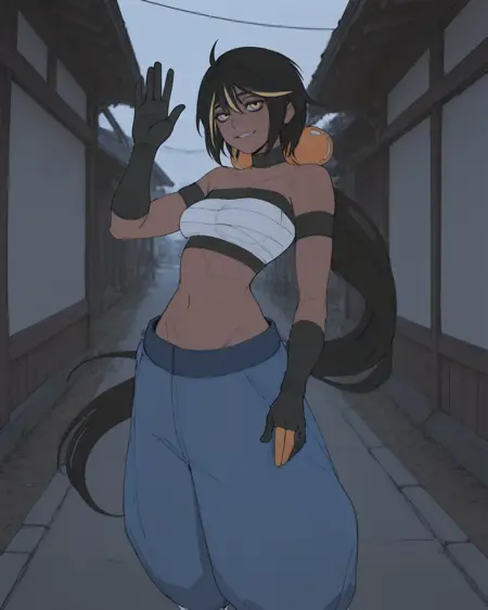 Outfit: chest sarashi, navel, baggy pants, gloves, bandages, bare shoulders