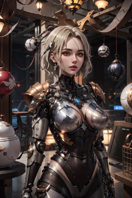 这是一个风格LoCon / LoRA,可以画出具有繁复结构的类蒸汽朋克/赛博朋克/... 反正就是机械风格的角色,取决于你填什么提示词。风格来源于Dylan Kowalski。