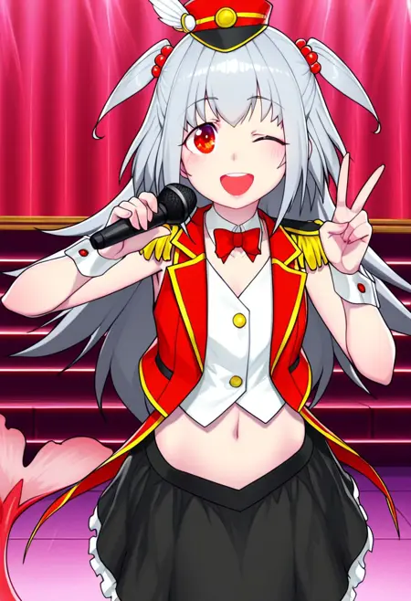 Idol outfit: white vest, frills, collar, red bowtie, red jacket, epaulettes, black skirt, hat, hair ornament, midriff, wristcuffs, tailcoat, sleeveless