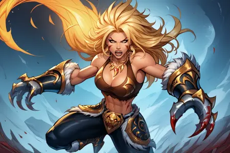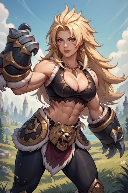 Trigger : msha, gloves with fur cuffs and metallic claws, boots with fur, belt armor with bear symbol with fur, spiky markings on belly side, spiky marking on cheek, black pants, a revealing tank top with fur, necklace, a fit muscular woman with long blonde spiky hair