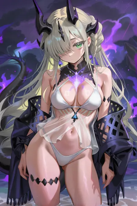necrass-swim, 매우 긴 머리, 회색 머리, 금발, 긴 머리, 드래곤 뿔, 한쪽 눈을 가린 머리, 땋은 머리결, 녹색 눈, 드래곤 소녀, 가슴선, 흰색 수영복, 중간 크기의 가슴, 보라색 불, 투명한 드레스, 여러 개의 리본, 배꼽, 보석, 어깨 노출, 드래곤 꼬리