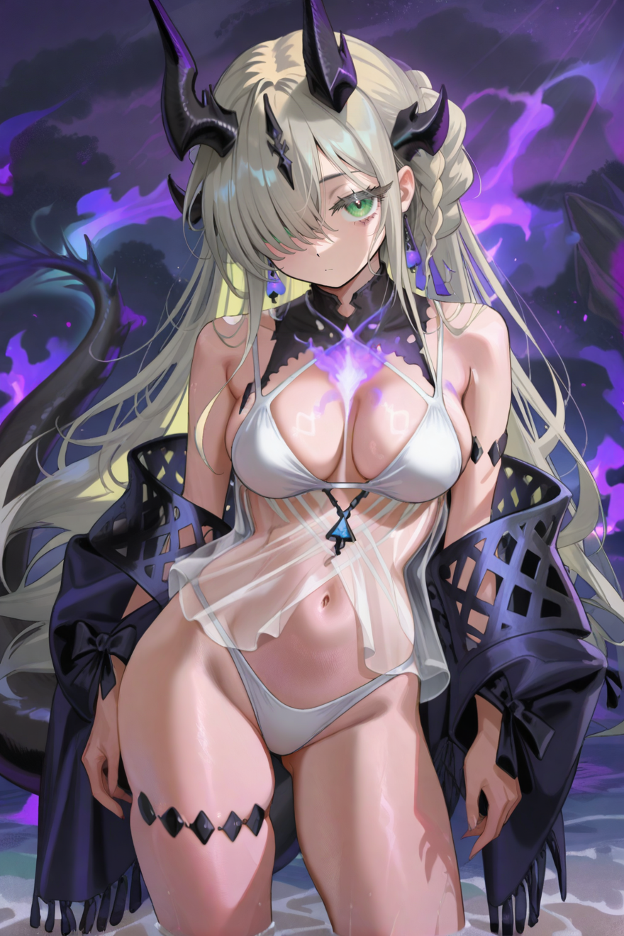 necrass-swim,very long hair,grey hair,blonde hair,long hair,dragon horns,hair over one eye,braided bun,green eyes,dragon girl,cleavage,white swimsuit,medium breasts,purple fire,see-through dress,multiple ribbons,navel,jewelry,bare shoulders,dragon tail