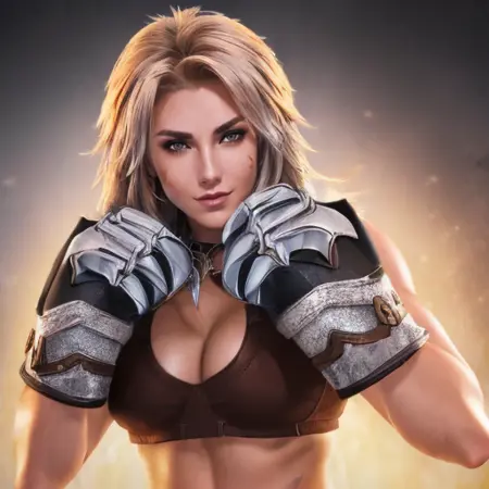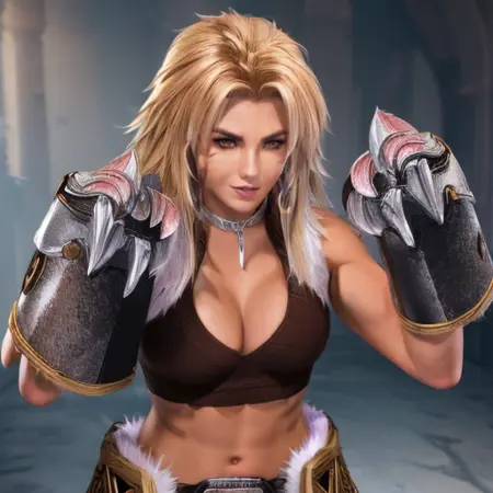 Trigger : msha, gloves with fur cuffs and metallic claws, boots with fur, belt armor with bear symbol with fur, spiky markings on belly side, spiky marking on cheek, black pants, a revealing tank top with fur, necklace, a fit muscular woman with long blonde spiky hair