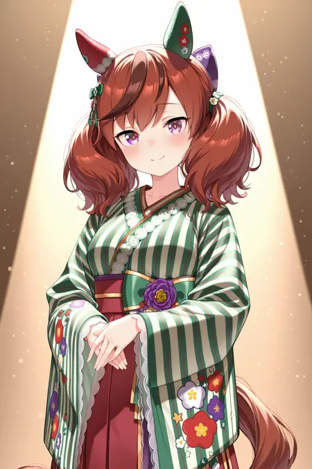 馬娘、馬の耳、馬の尾、ツインテール、茶色の髪、ストライプ髪、額の間の髪、ツートーンヘア、髪リボン、茶色の目、灰色の目、