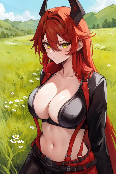 触发词:redhood, 长发, 红发, 大胸, 肚脐, 角, 机械角, 天线发, 腰带, 手套, 夹克, 皮裤, 红围巾, 拉链未拉, 髋部通风口