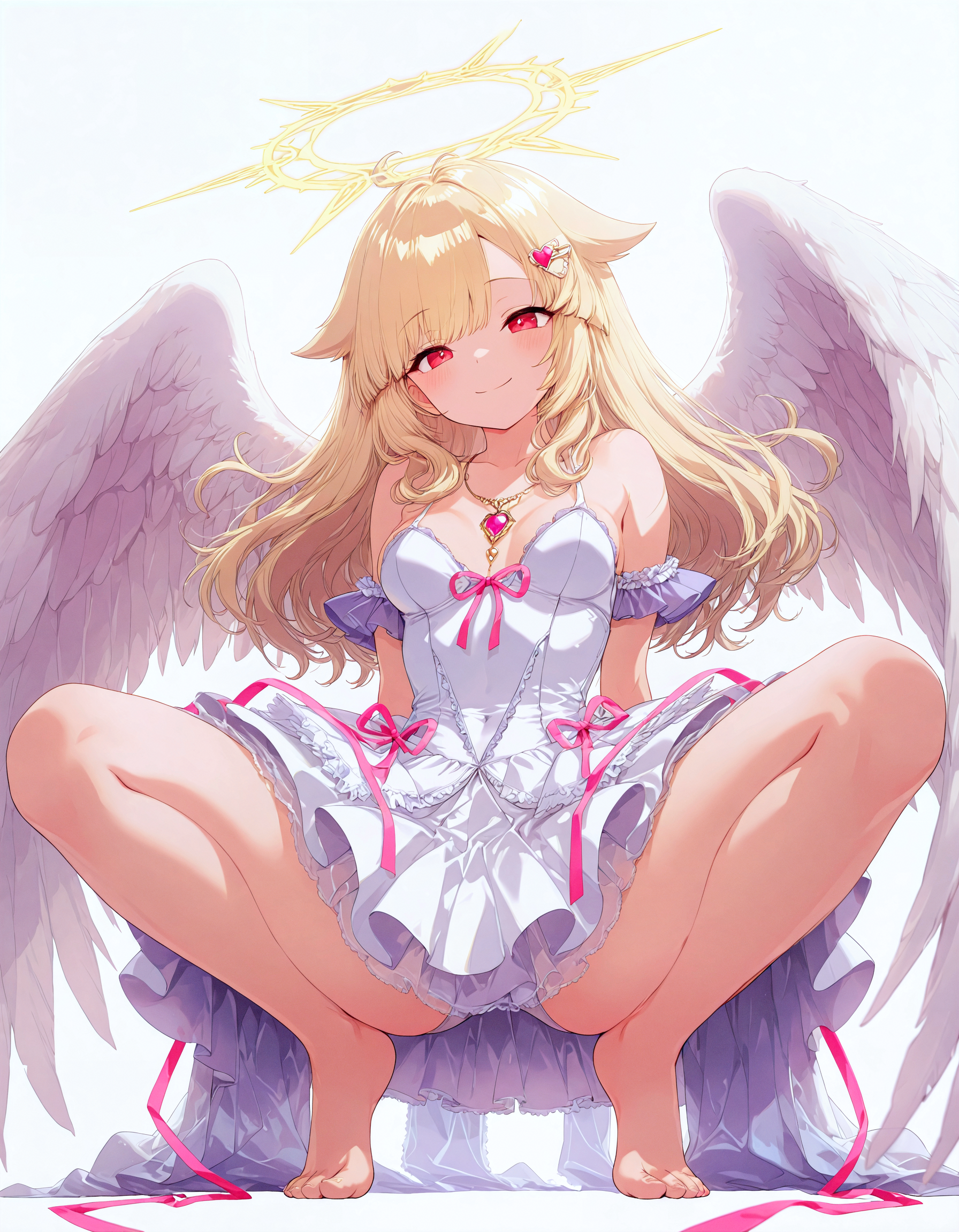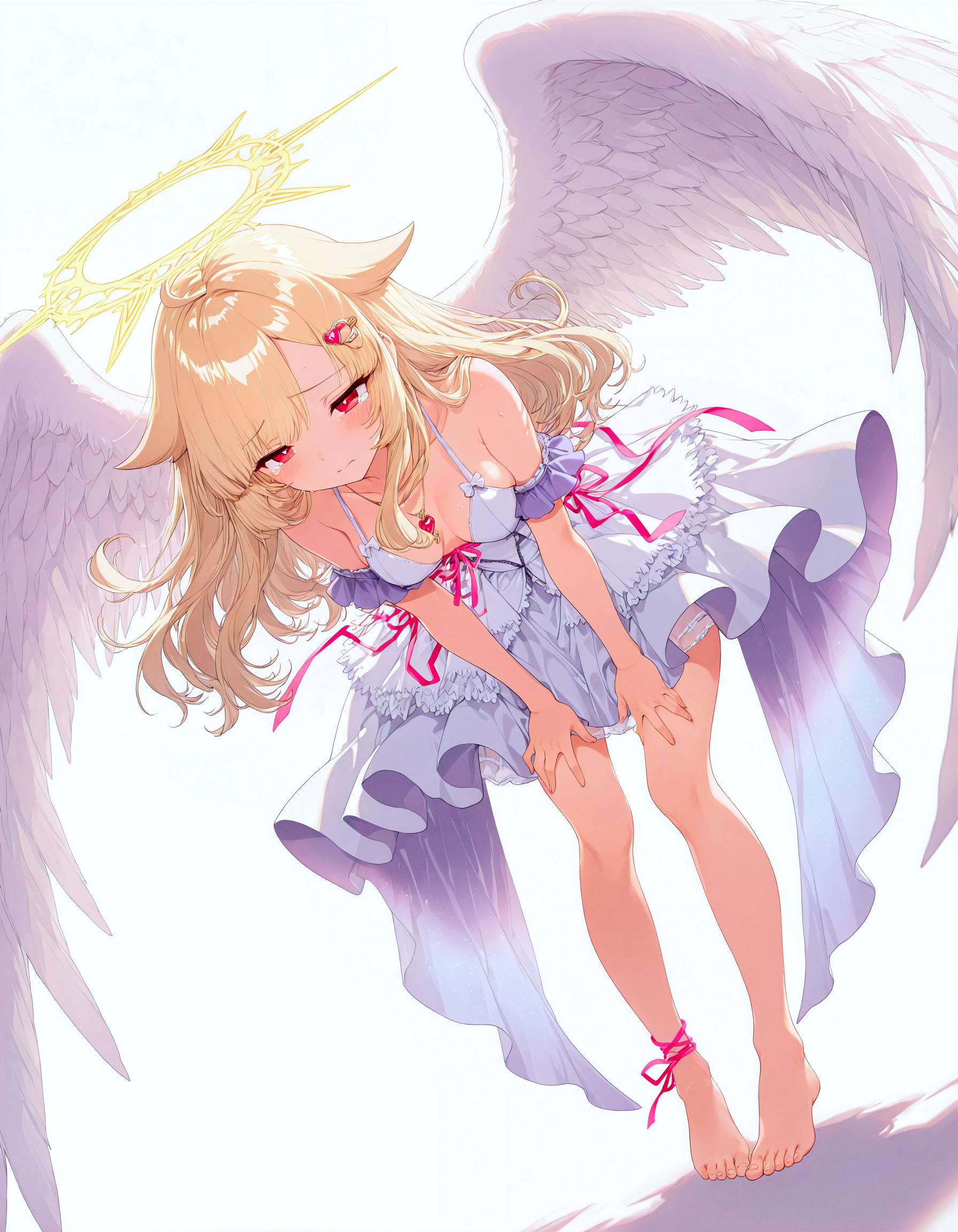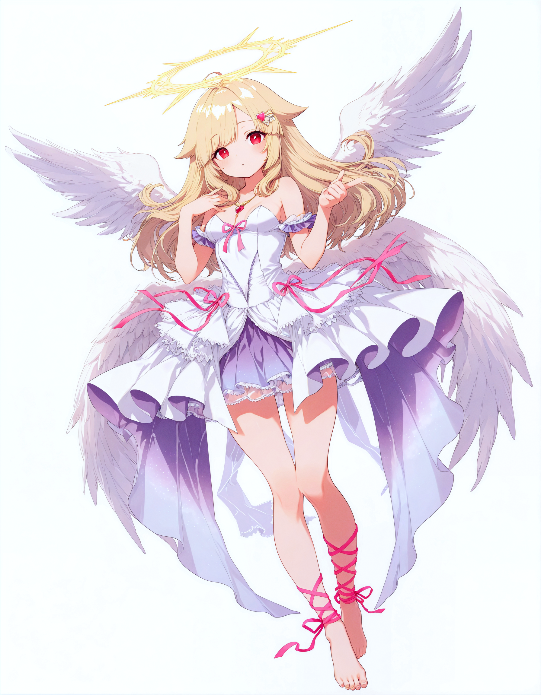 Keiten no Aloe, 특별한 의상, 1girl, 솔로, 날개, 드레스, 고급 환상, 붉은 눈, 긴 머리, 금발 머리, 천사, 천사 날개, 깃털 날개, 리본 드레스, 하트 머리 장식, 머리핀(흰 리본, 보석), 목걸이(리본, 보석, 보석), 발가락, 어깨 노출, 흰색 날개, 리본, 풀바디, 보석, 분홍 리본, 네 개의 날개,