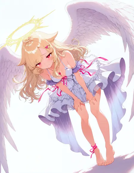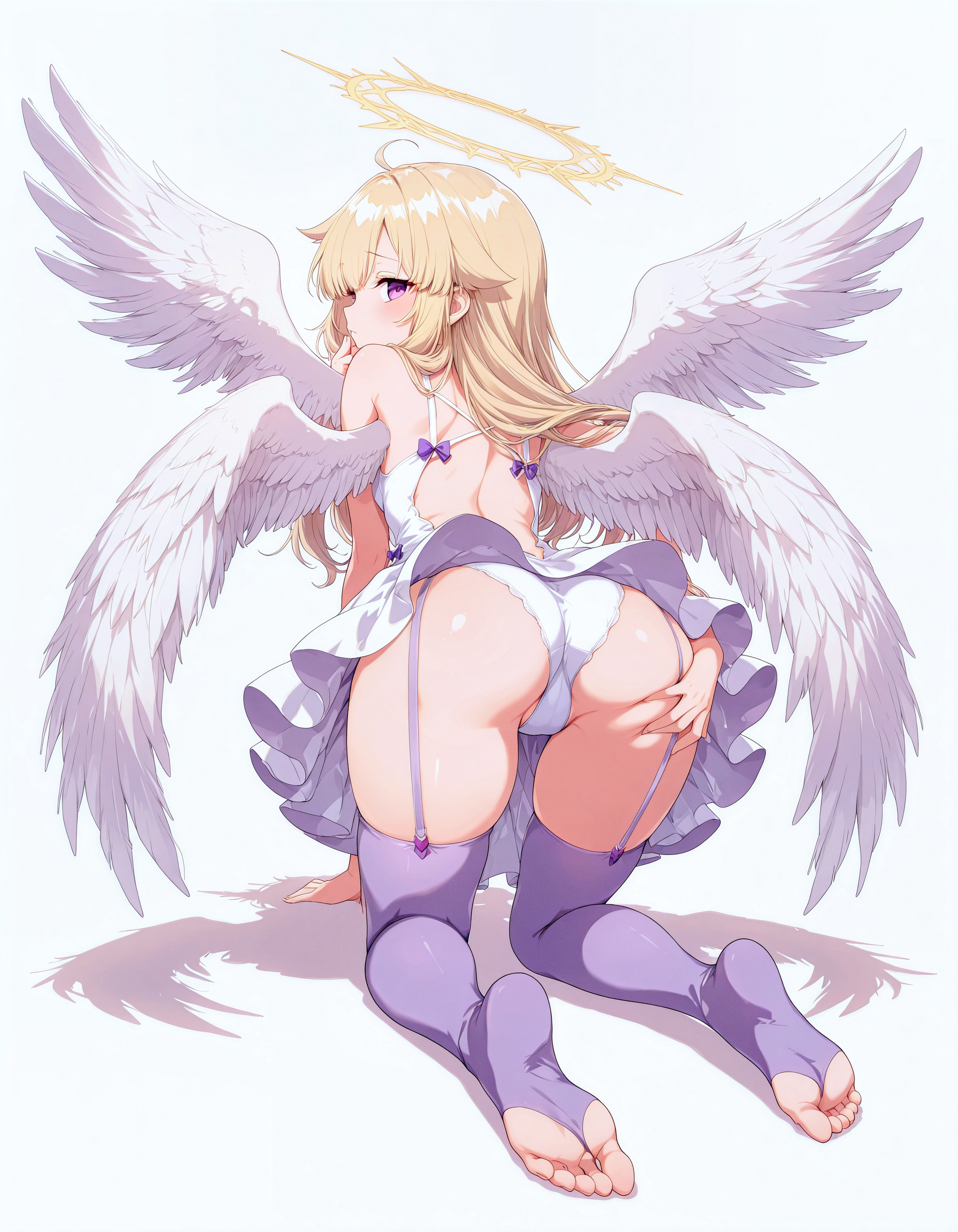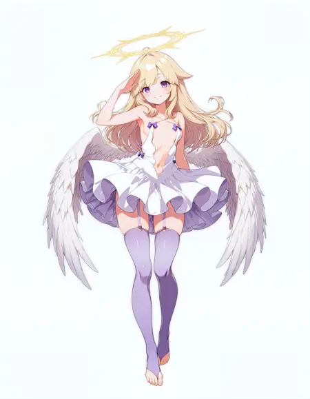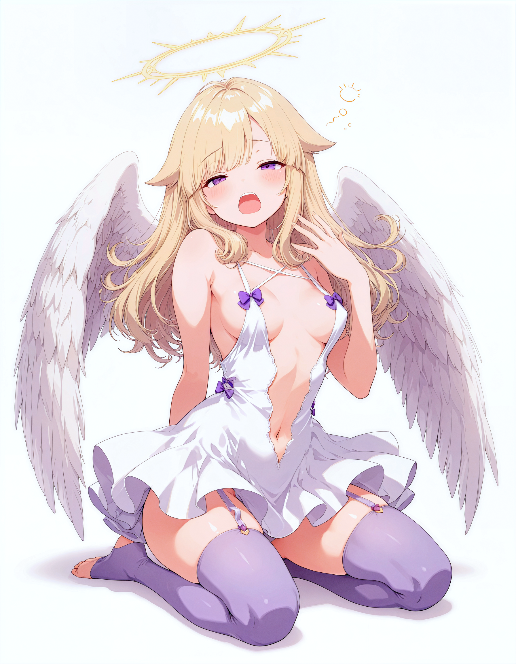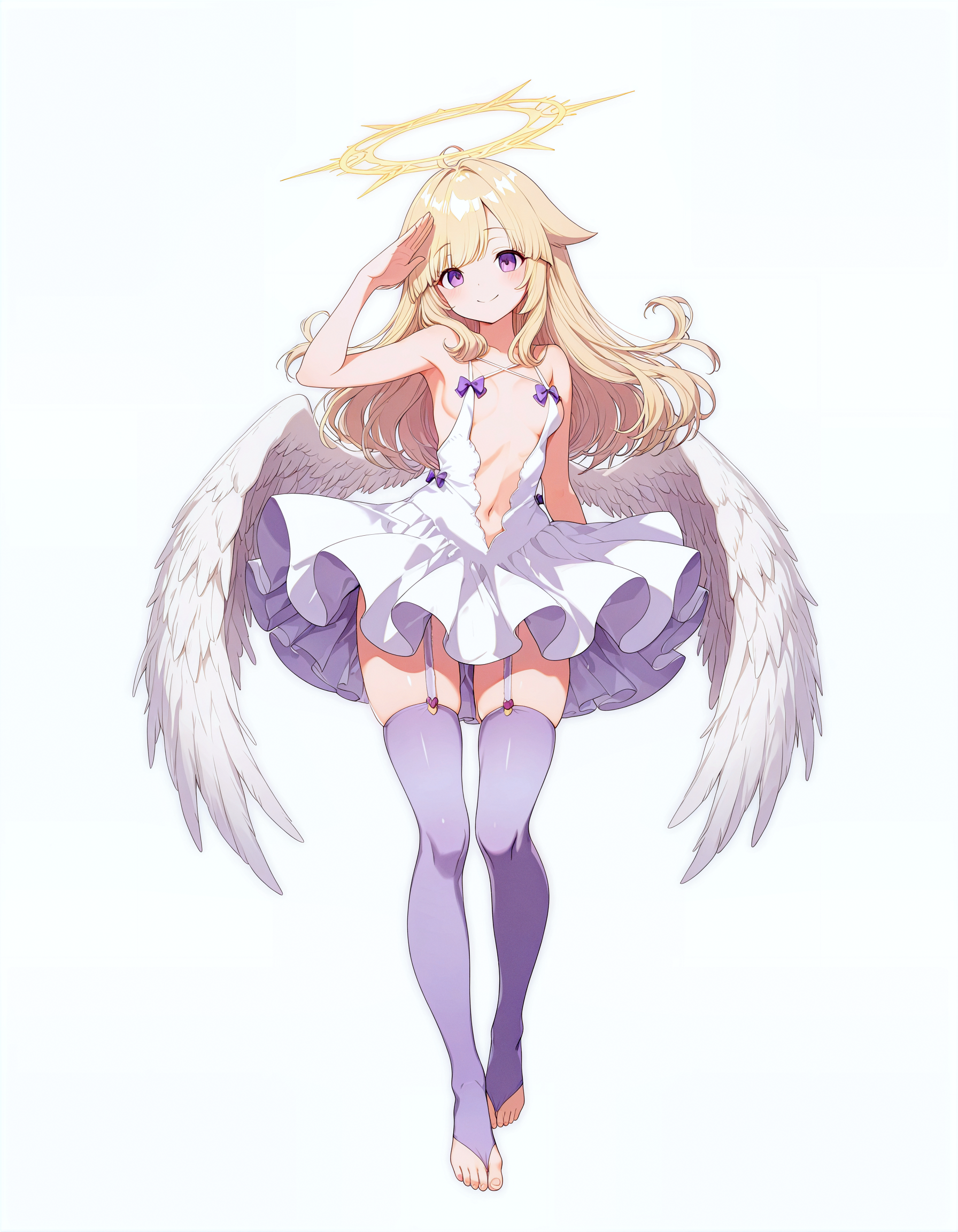 Keiten no Aloe, 솔로, (더블 윙:1.2), 히프하이스, 날개, 천사, 긴 머리, 환상, 빛나는, (원형 환상), 금발 머리, 보라색 눈, 1girl, 풀바디, 배꼽, 흰색 깊은 V넥 드레스, 가터 스트랩, 시청자 바라보기, 신발 없음, 발가락 없음 양말, 보라색 리본, 흰색 날개, 타비 양말, 두 발가락 양말,