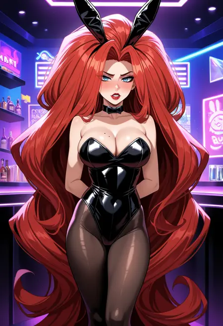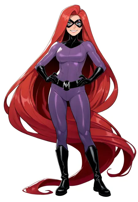 衣装プロンプト:紫のボディスーツ、黒いブーツ、黒い手袋、ベルト