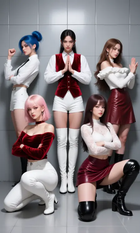 K-팝 포즈는 멤버가 여럿인 아이돌 그룹의 특징적인 룩과 에너지를 포착합니다: 생동감 있는 자세, 동기화된 댄스 라인, 자신감 넘치는 포메이션, 그리고 정제된 에디토리얼 K-팝 미학이 모두 담겨 있습니다.