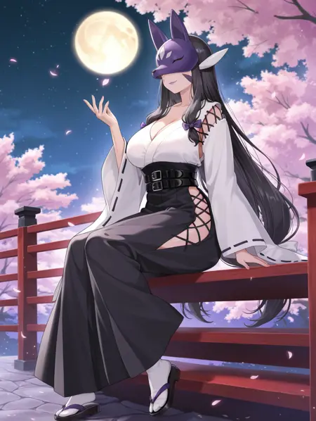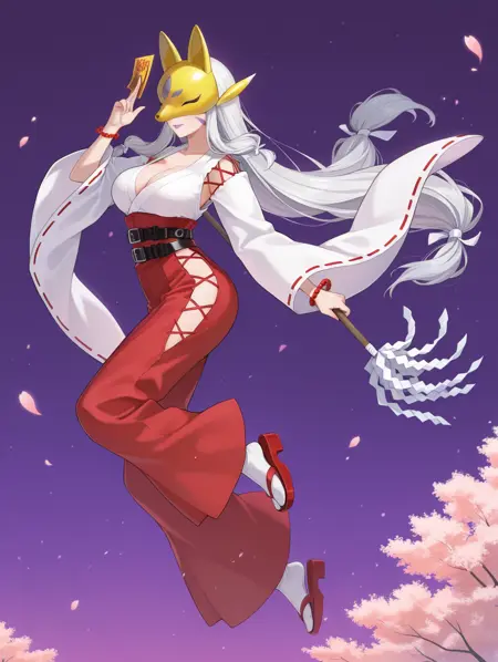 タグ(衣装 - 2 巫女姿):kuzuhamon、公式の別装備、巫女、顔を覆う、目を覆う、紫色の狐の仮面、白いリボン、髪のリボン、白い着物、黒いベルト、黒い袴、足袋、黒い草履、黒いリボン縁取り