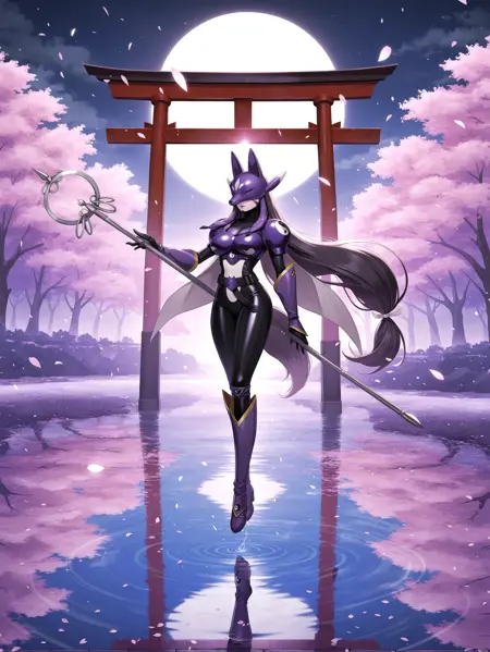 タグ(衣装 - 2):目を覆う、顔を覆う、紫色の狐のヘルメット、白いマント、紫の肩の鎧、紫の胸当て、黒いボディスーツ、紫の手甲、ベルト、紫の膝丈ブーツ