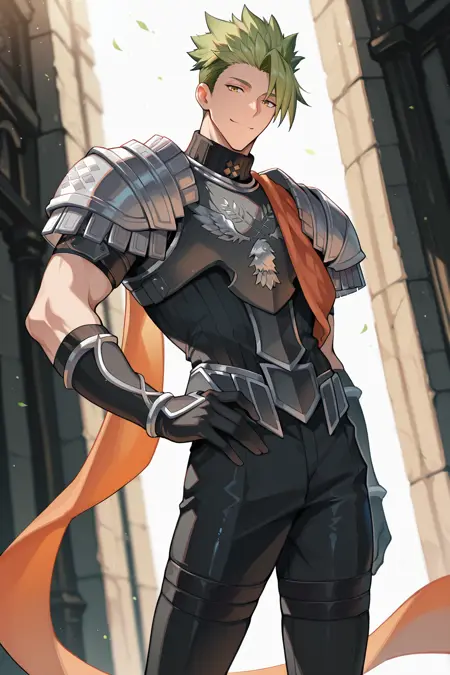 alternate costume, orange scarf, armor, shoulder armor, black pants, pauldrons