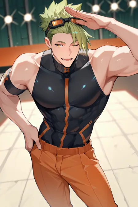 achilles (fearless diver) (fate), compression shirt, black shirt, sleeveless, orange pants