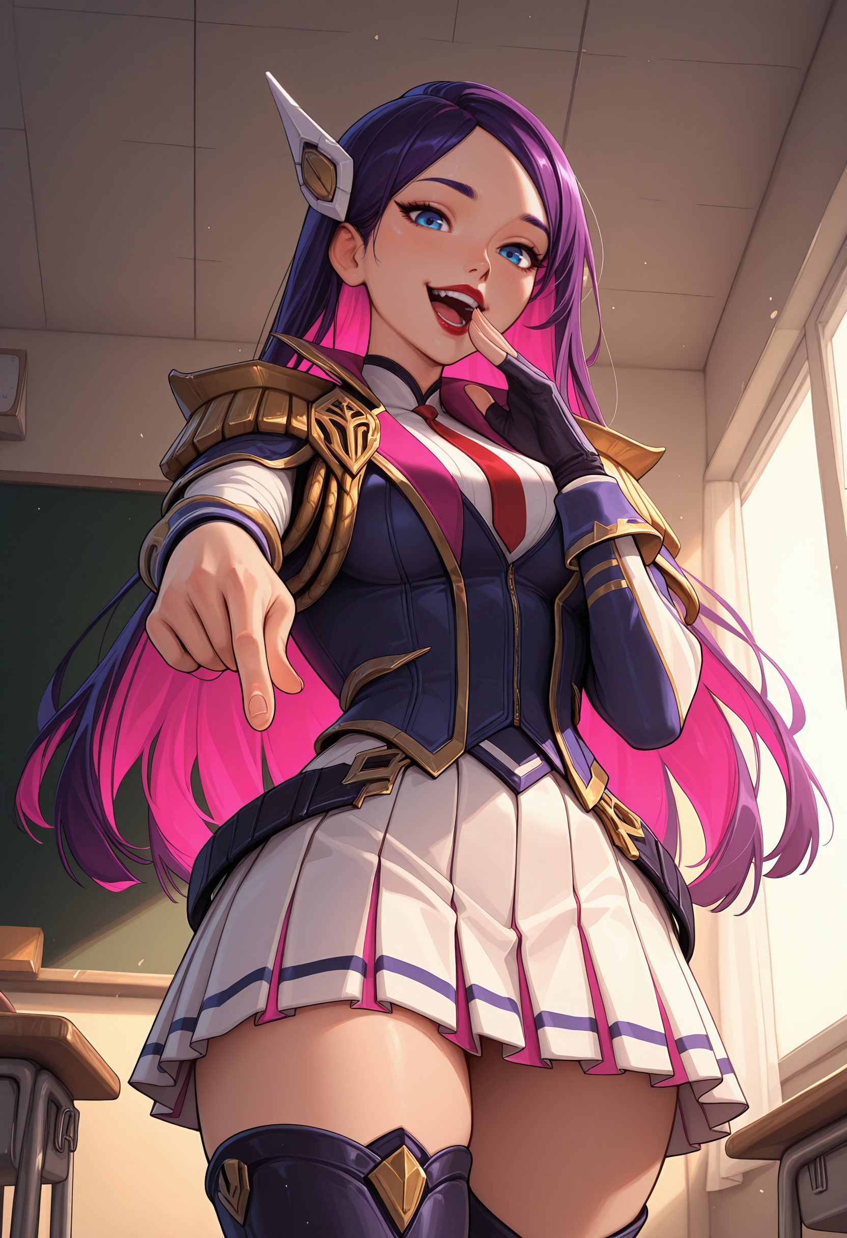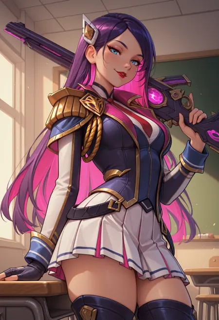 bacaitlynil, medium breasts, long hair, purple hair, pink hair, colored inner hair, multicolored hair, two-tone hair, parted bangs, blue eyes, red lips, long sleeves, hair ornament, jacket, pleated skirt, belt, zettai ryouiki, thigh boots, white skirt, white shirt, multicolored clothes, single fingerless glove, red necktie, open jacket, epaulettes, uniform, headgear, aiguillette,