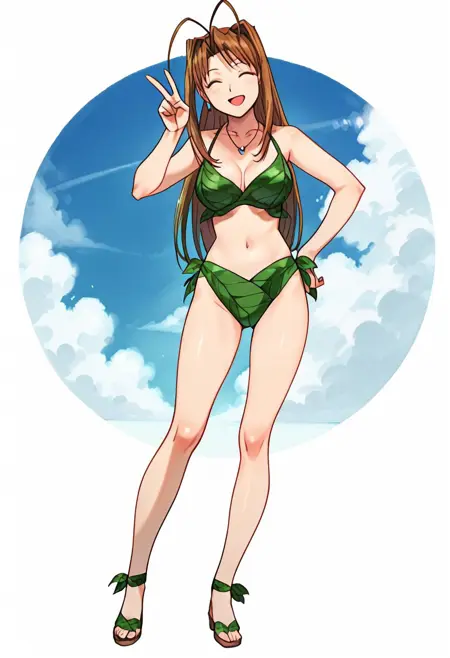 naru, 1girl, solo, swimsuit, brown hair, long hair, bikini, antenna hair, jewelry, necklace, green bikini, breasts, leaf bikini