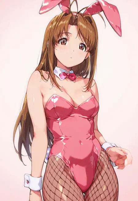 naru, 1girl, solo, animal ears, playboy bunny, pantyhose, rabbit ears, fishnets, fishnet pantyhose, brown hair, long hair, wrist cuffs, fake animal ears, leotard, detached collar, brown eyes, official alternate costume, breasts, strapless leotard