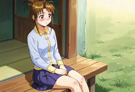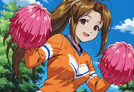 naru, 1girl, solo, pom pom (cheerleading), day, cheerleader, brown hair, orange shirt, brown eyes, long hair, ponytail, shirt, long sleeves