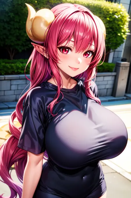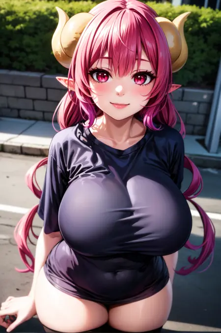 IluluDragonMaid_NDV, 1girl, pink hair, huge breasts, long hair, horns, black t-shirt, black thighhighs, red eyes, dragon girl, slit pupils, pointy ears