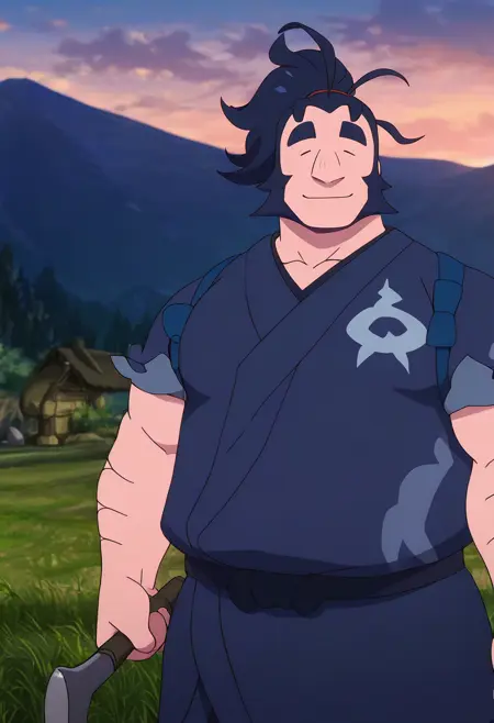 tauemon: tauemon, 1boy, 진한 파란색 머리카락, 단발머리, 긴 콧수염, 두꺼운 눈썹, 팔 털, 성숙한 남성, 기모노, 눈 감음, 통통한 몸매